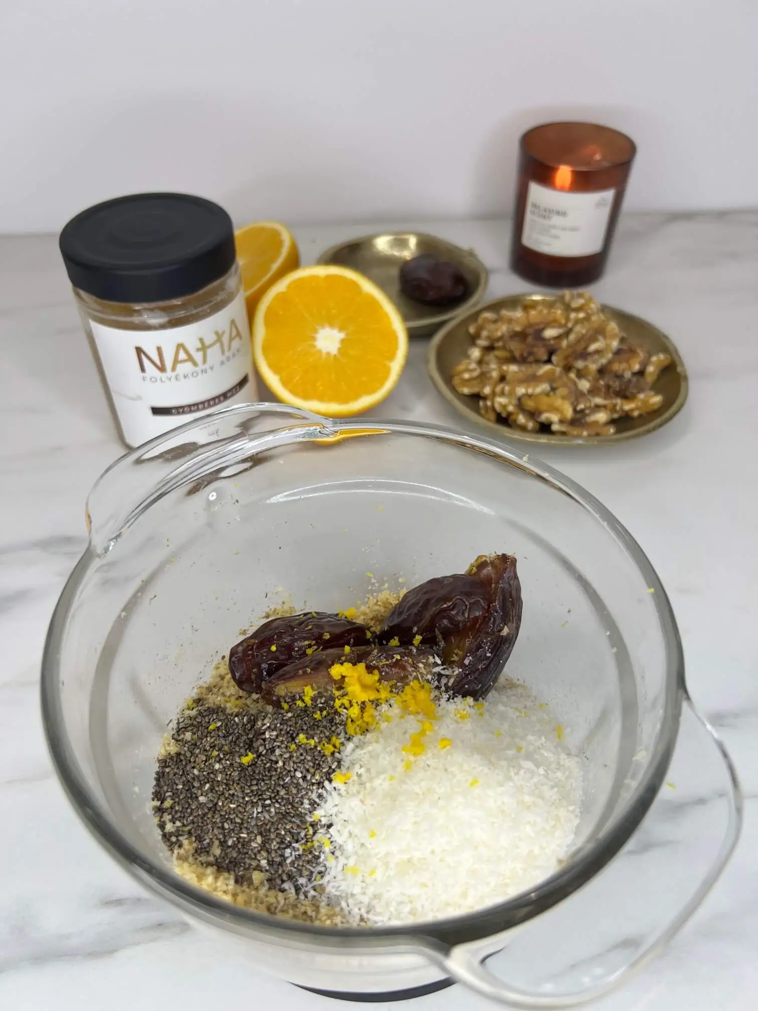 Add hozzá a darált dióhoz a kimagozott és apróra vágott datolyát, a kókuszreszeléket, a chia magot, a gyömbéres mézet, valamint a frissen facsart narancs levét és finomra reszelt héját.